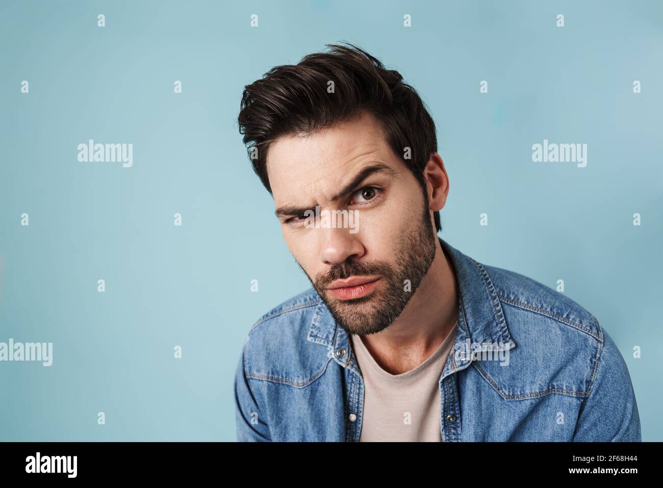 A portrait of a brooding man. The unshaven male rests his cheek on his ...