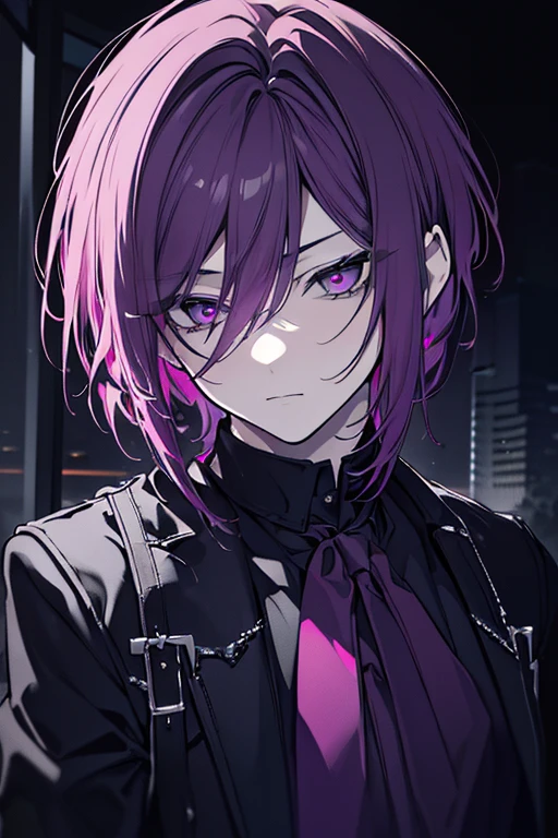 A dark and brooding young man, pink and purple hair, long slanted eyes ...