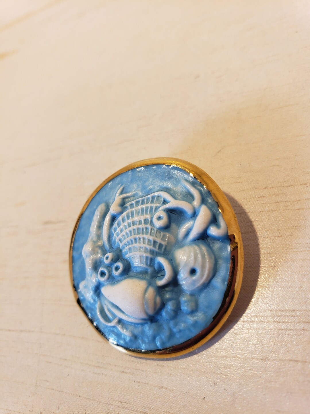 Vintage Brooke Andrews Ceramic Sea Shells Brooch Pendant Blue White and ...