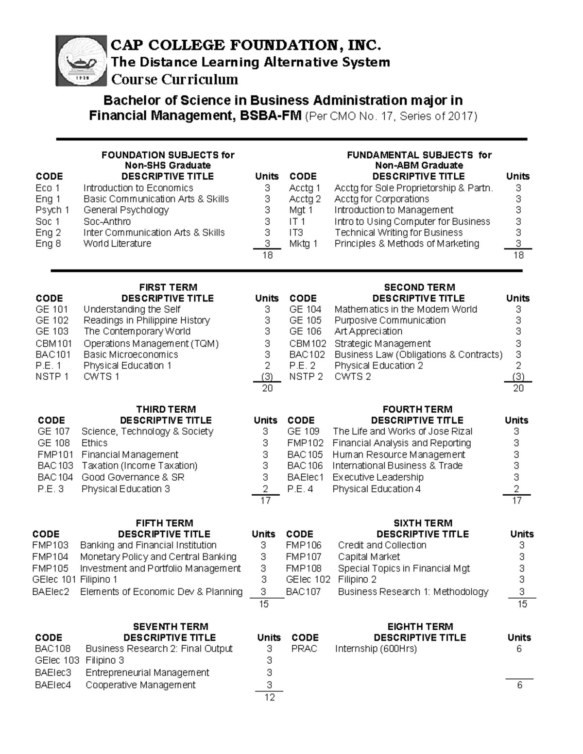 BSBA-FM Course Curriculum Overview with Bridge Program - Studocu