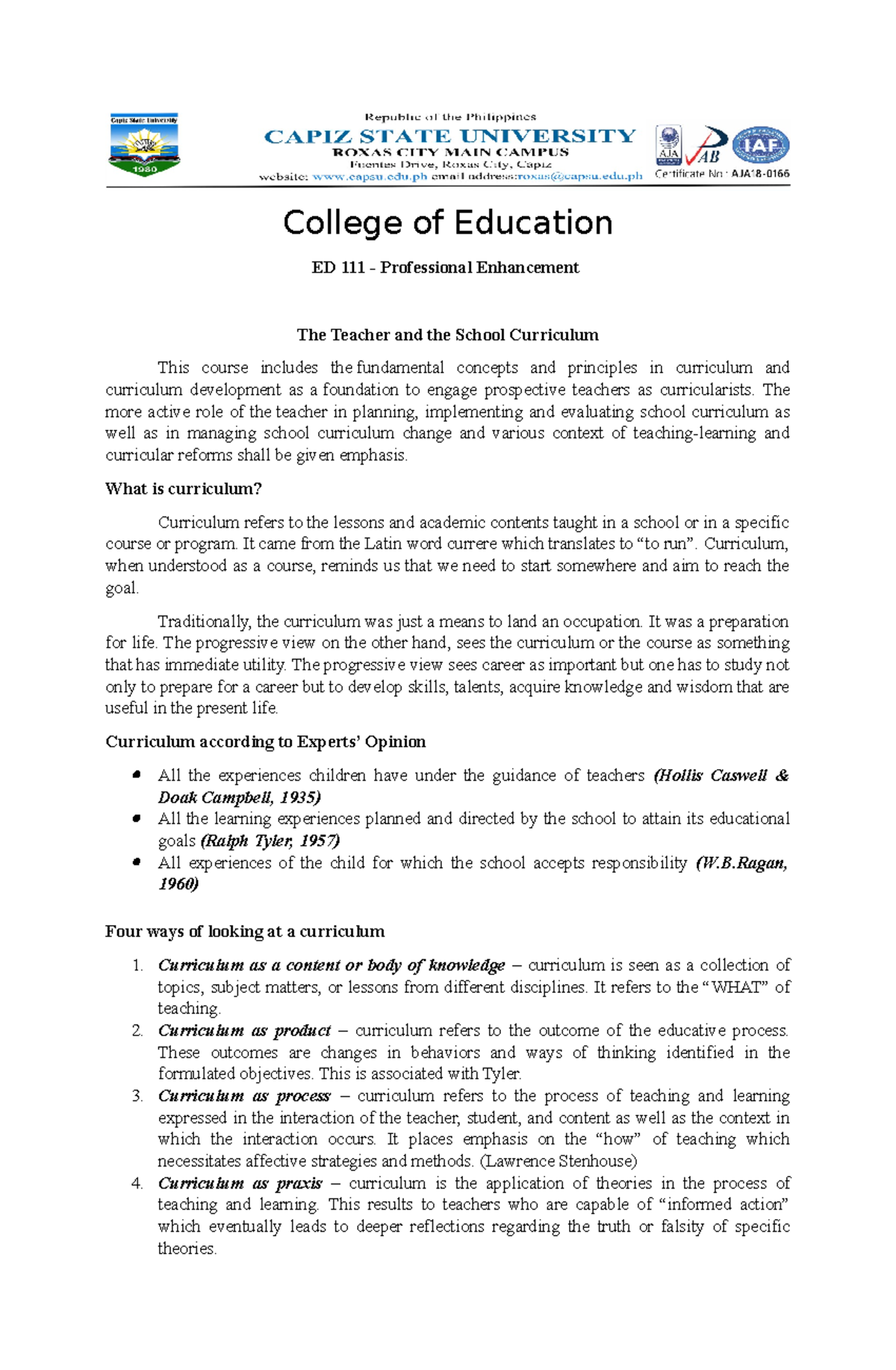 The Teacher and the School Curriculum - Bsed Filipino - CapSU - Studocu