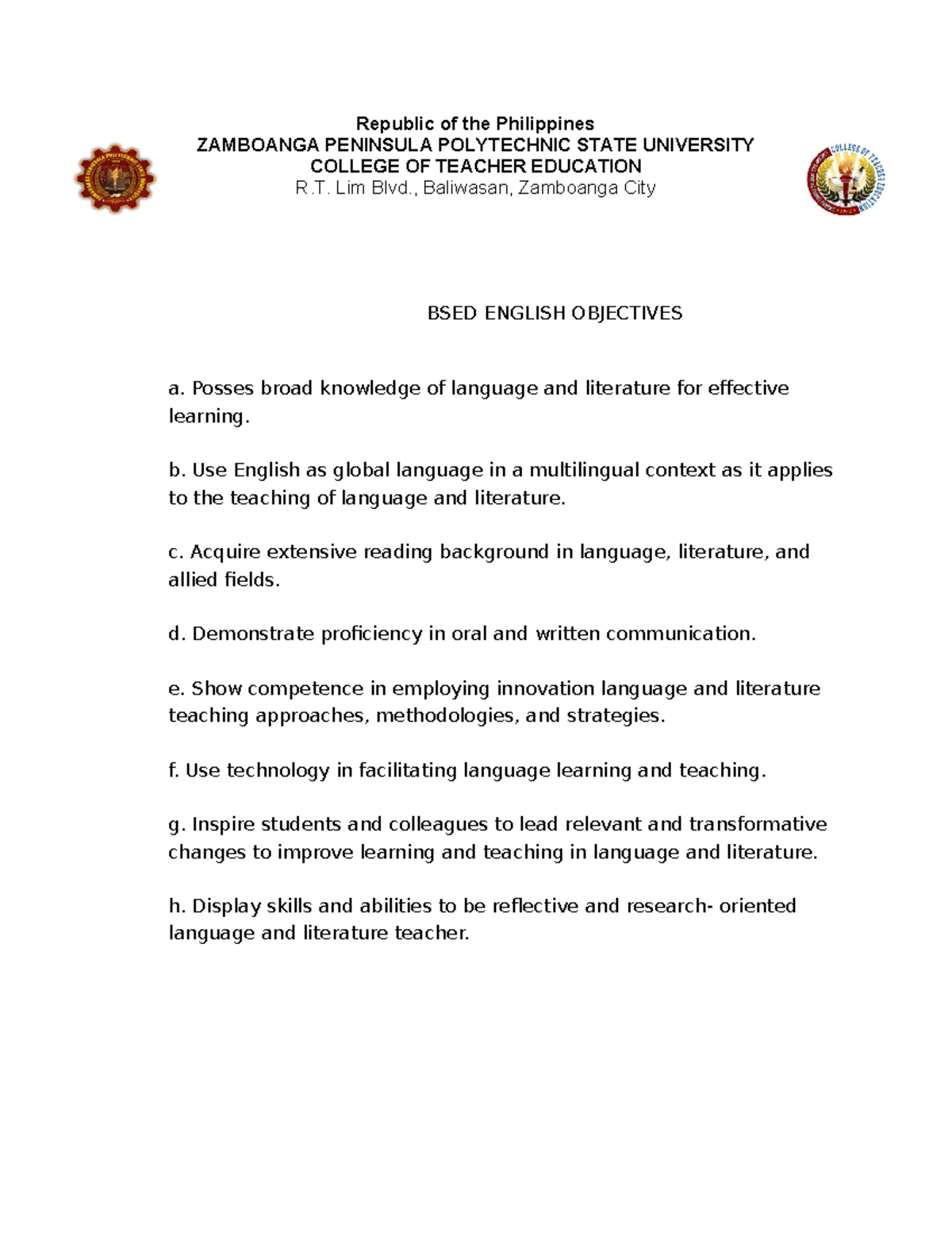 BSED English Objectives 12 - Republic of the Philippines ZAMBOANGA ...