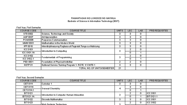 BSIT Curriculum Overview: First & Second Year Courses - Studocu