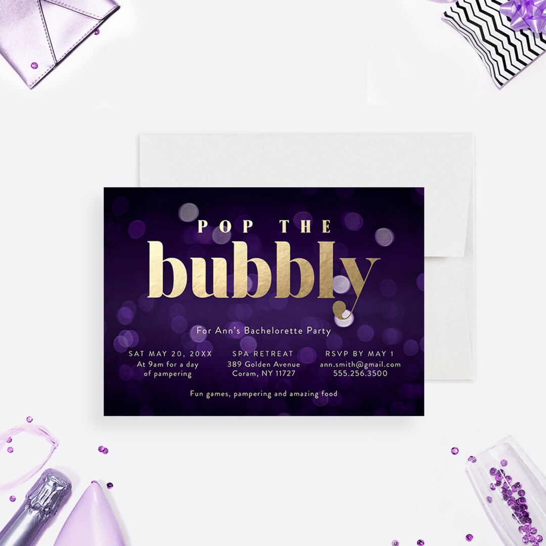 Pop the Bubbly Invitation Card for Bachelorette Party in Purple and ...
