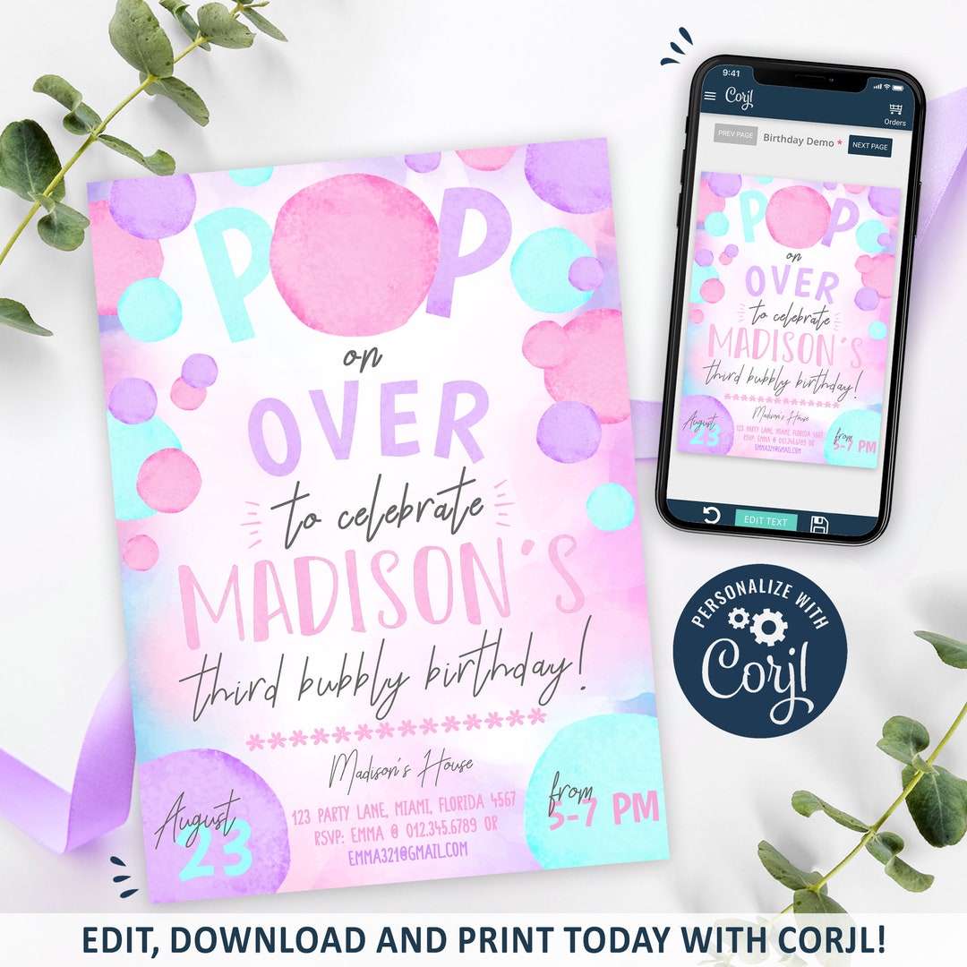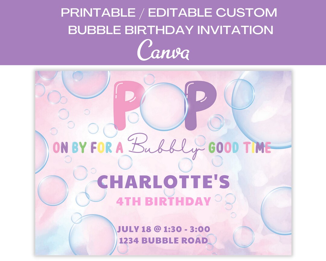 Editable Bubbles Birthday Invitation, Pop on by Birthday Party Invite ...