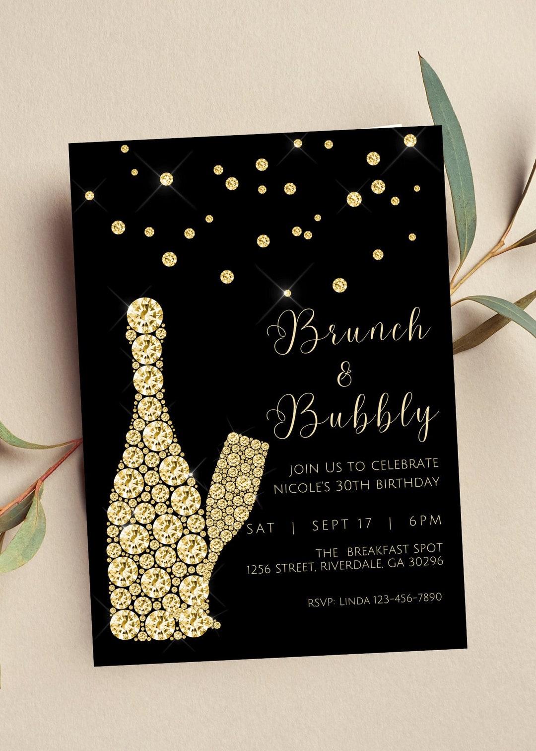 Editable Brunch and Bubbly Invitation, Black and Gold Birthday Brunch ...