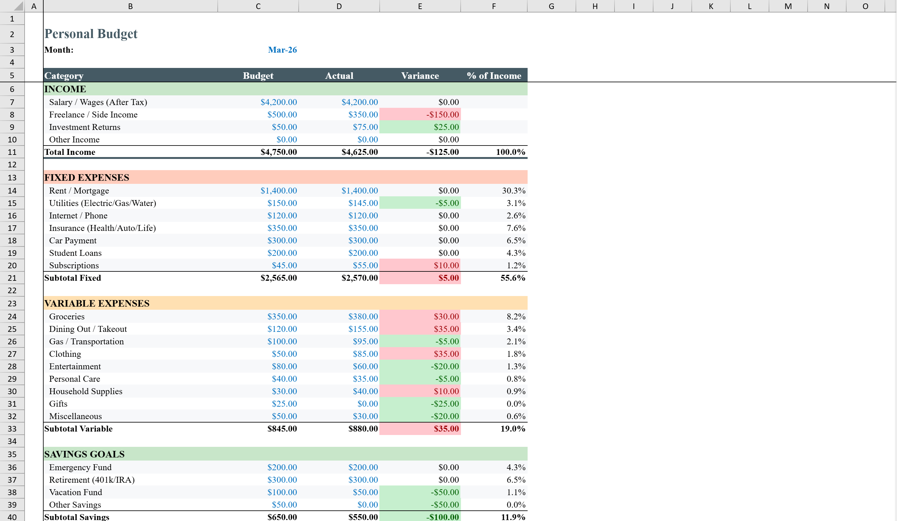 Personal Budget Excel Template
