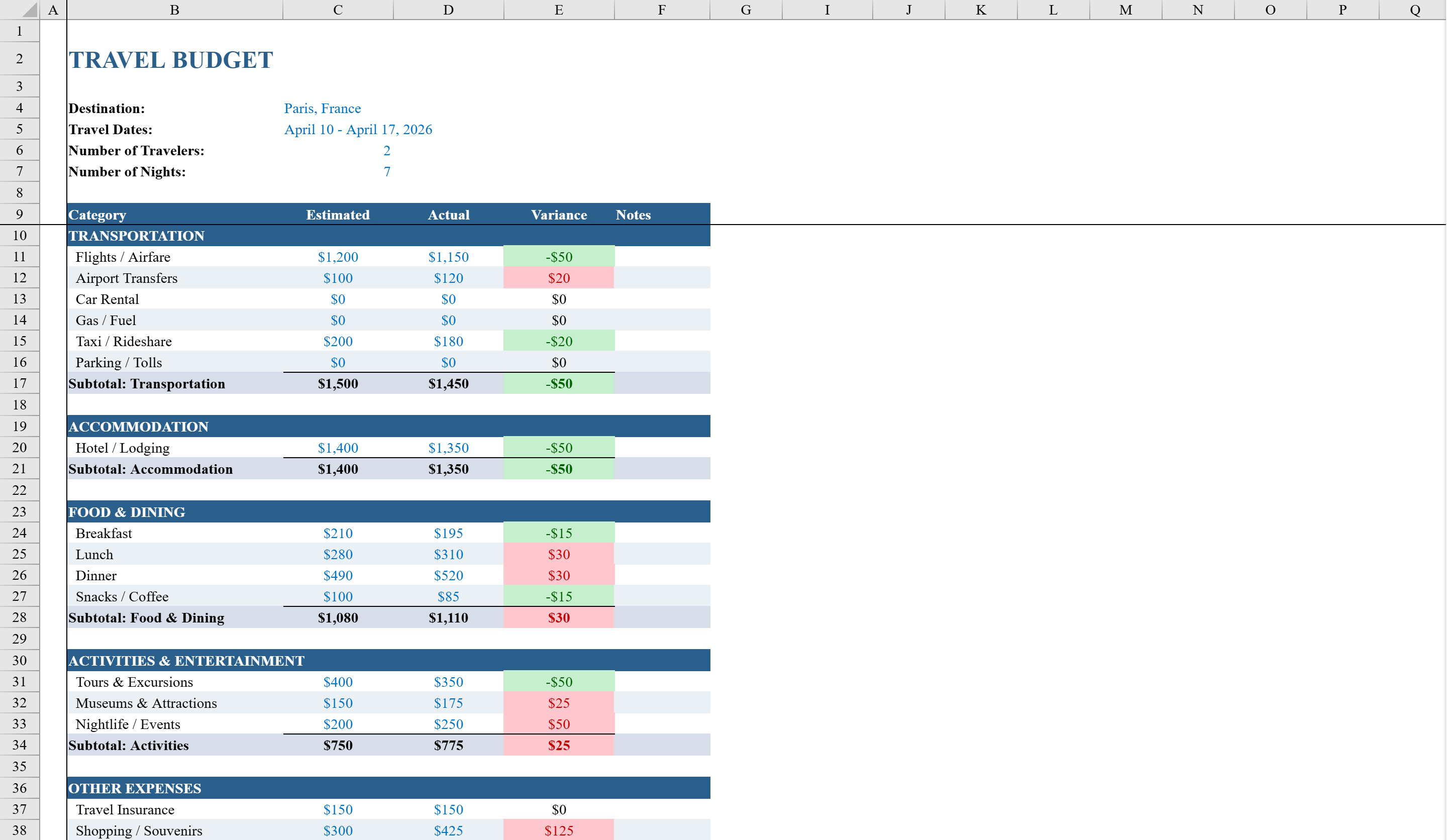 Free Travel Budget Template for Excel | Shortcut