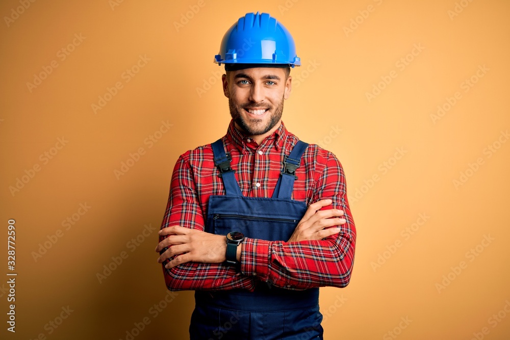 Young builder man wearing construction uniform and safety helmet over ...