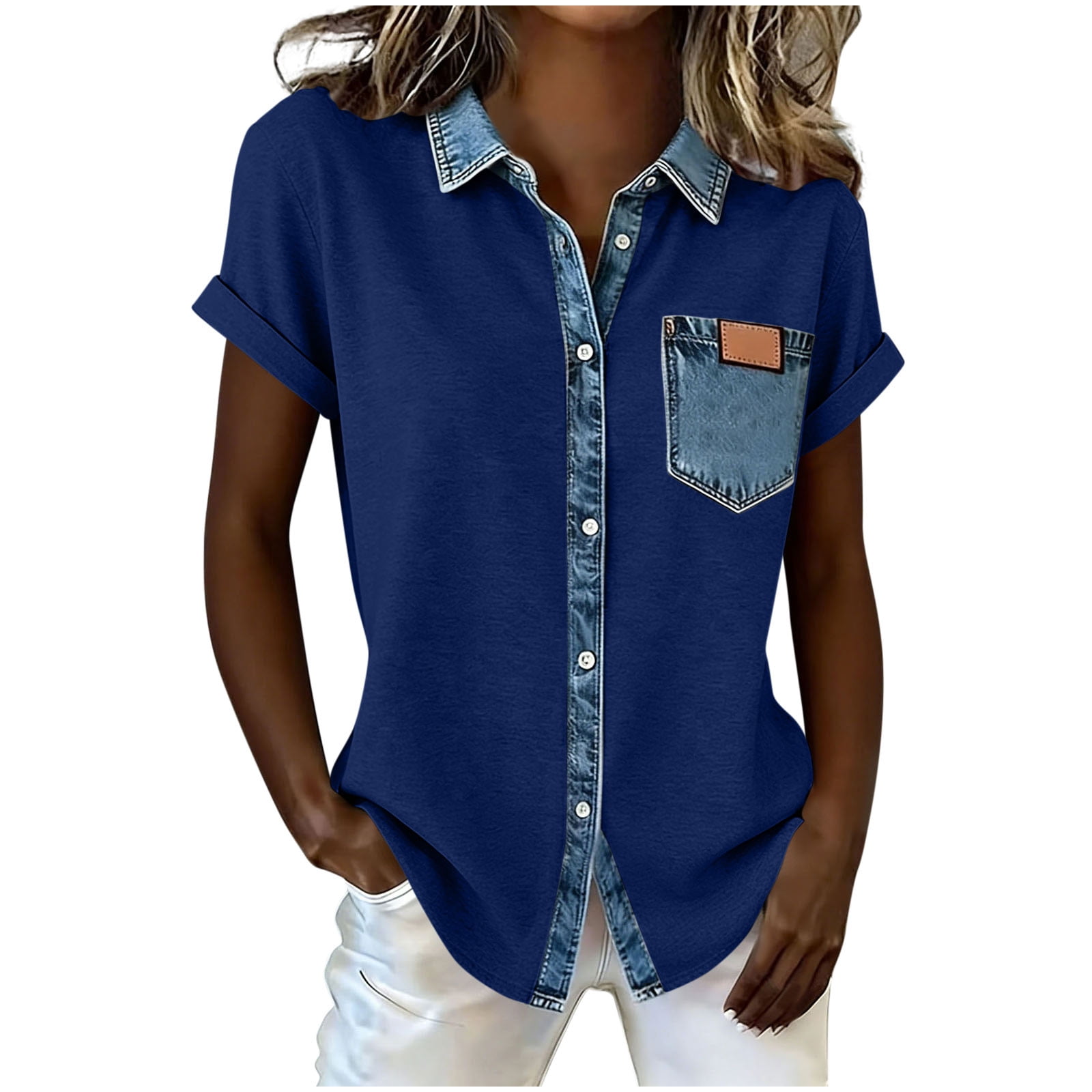 Ashyfjp Womens Blouses Fashion Denim Patchwork Short Sleeve Collared ...