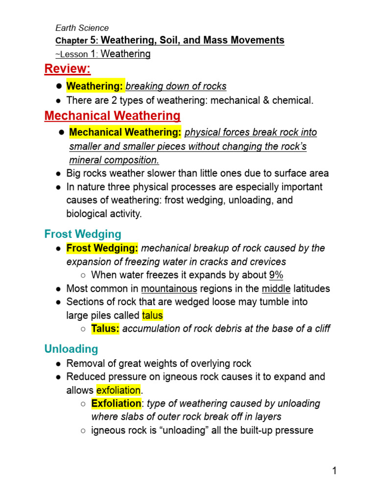 E.S. 5.1 Bullet Point Notes | PDF | Weathering | Rock (Geology)
