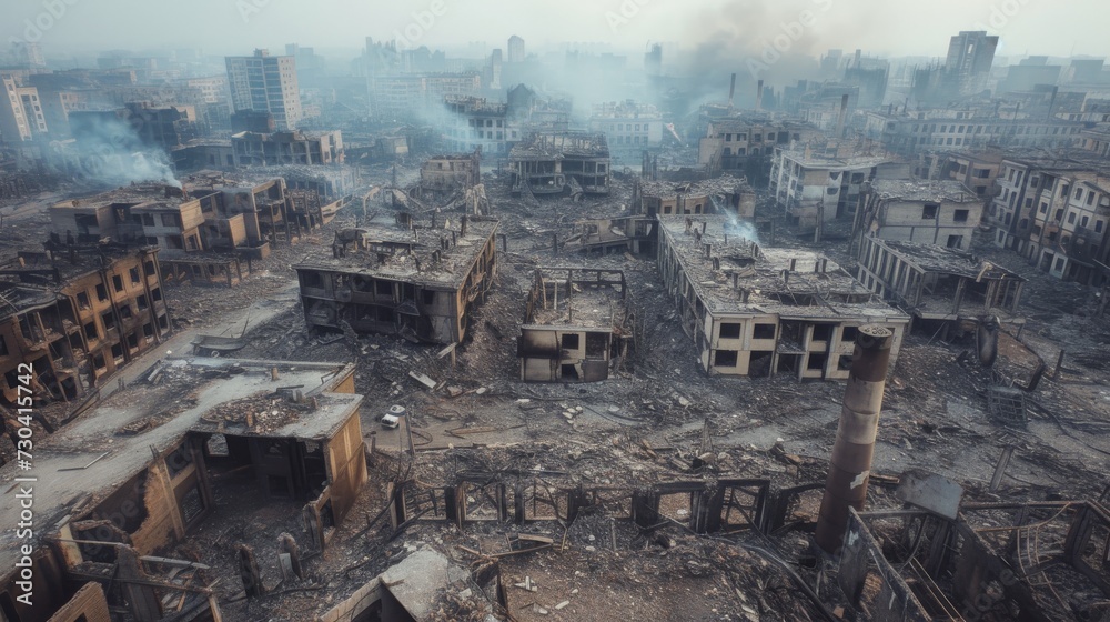 war-torn city, destroyed buildings, bullet holes in walls, shell holes ...