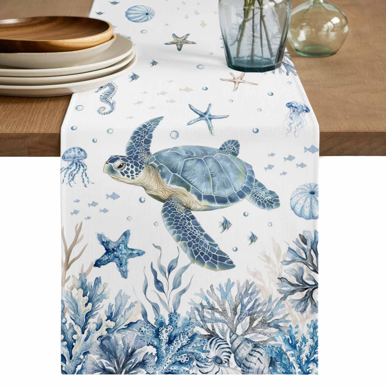 Blue Sea Turtles Table Runner 108 Inches, Coastal Ocean Sea Starfish ...