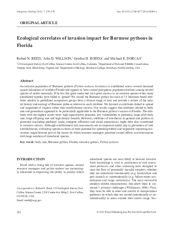 (PDF) Ecological correlates of invasion impact for Burmese pythons in ...