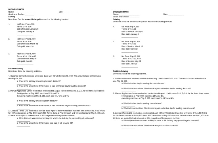 Business Math Problem Solving | PDF | Discounts And Allowances | Invoice