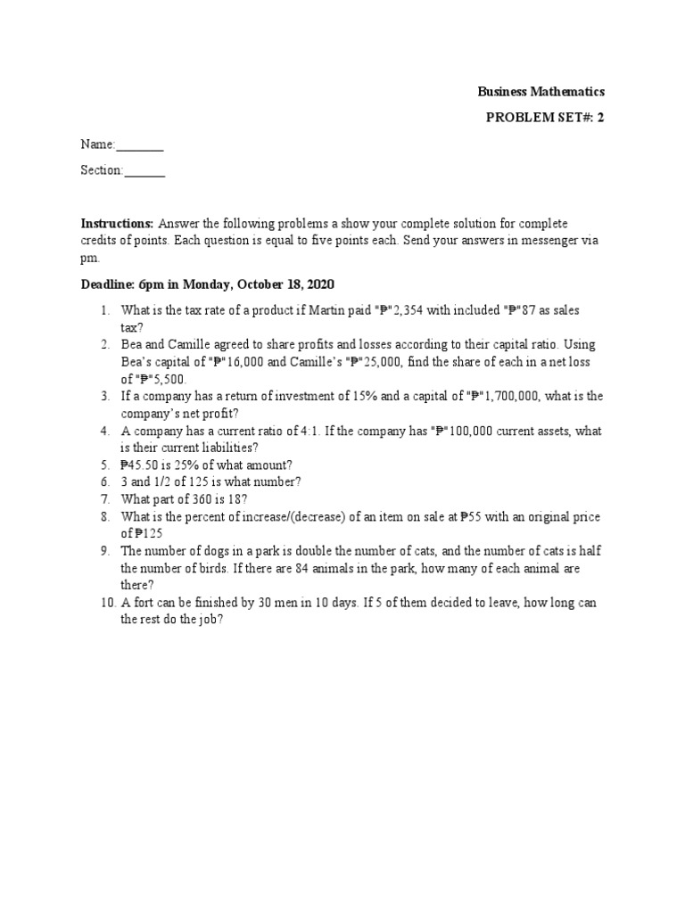 Business Math Problem Sets | PDF | Percentage | Numbers