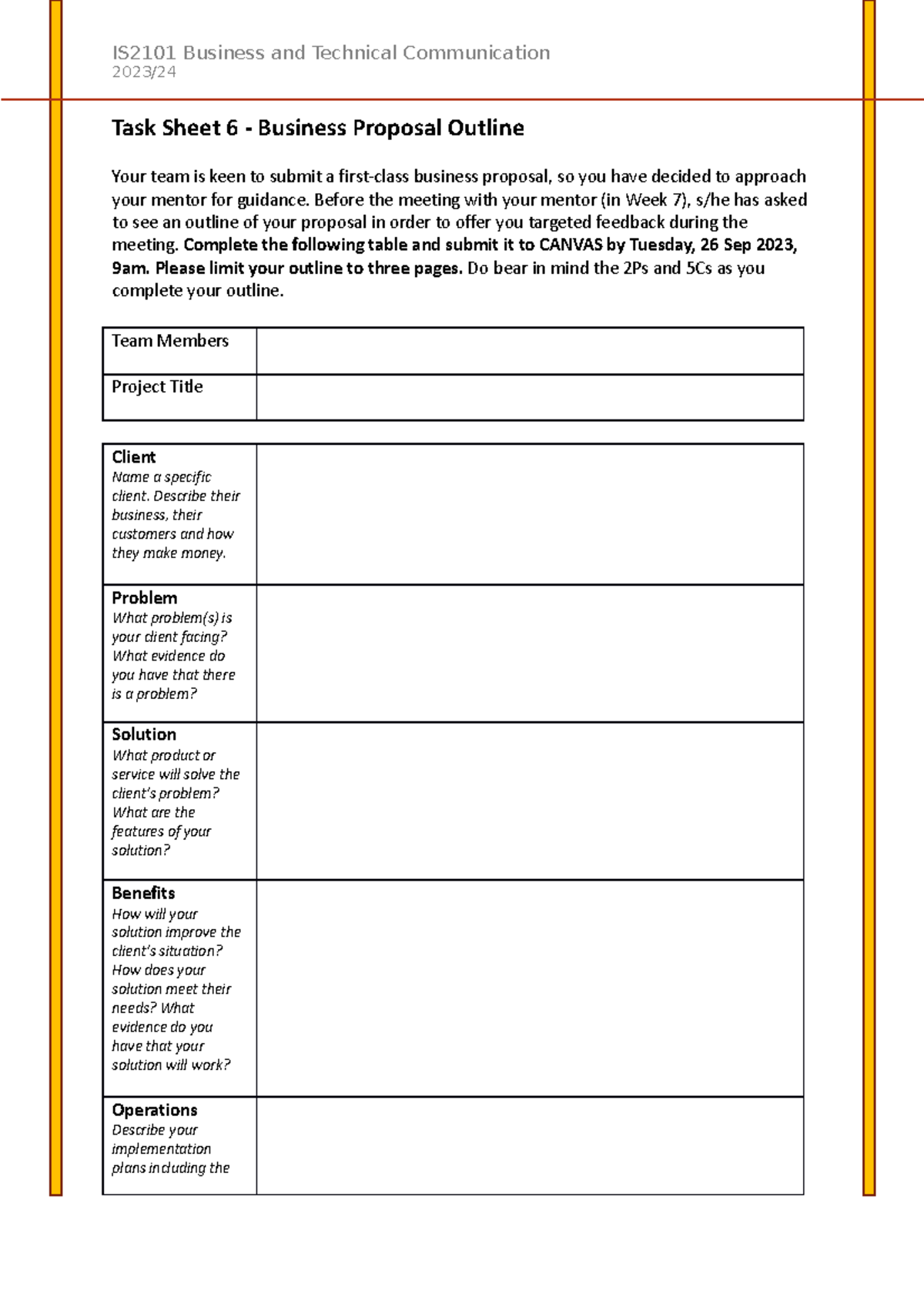 5.2 Task Sheet 6 - Business Proposal Outline AY2324 - IS2101 Business ...