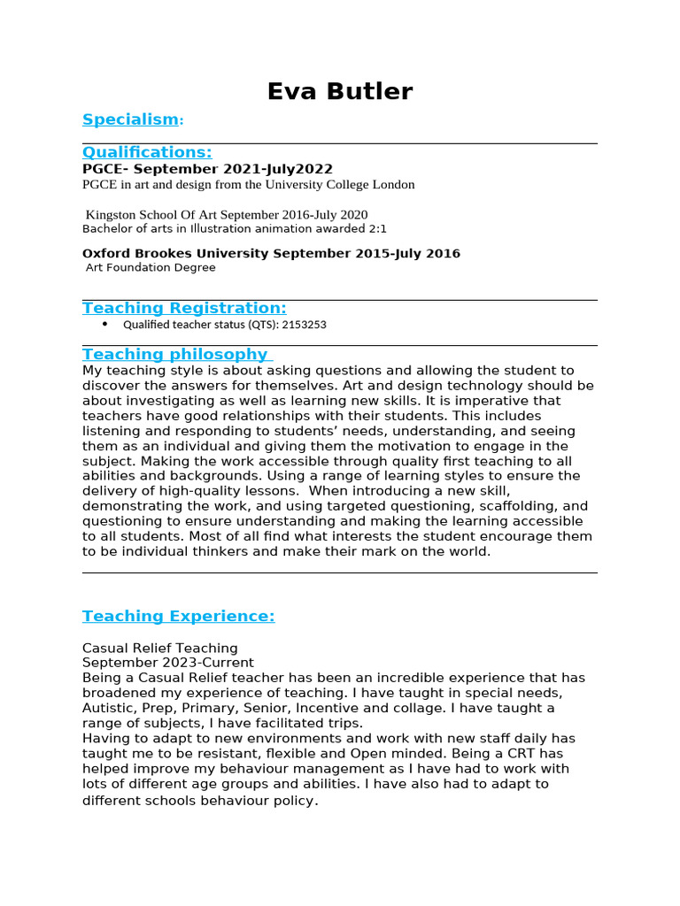 Eva Butler CV 2024 - UK Art and Design Teacher | PDF | Teachers ...