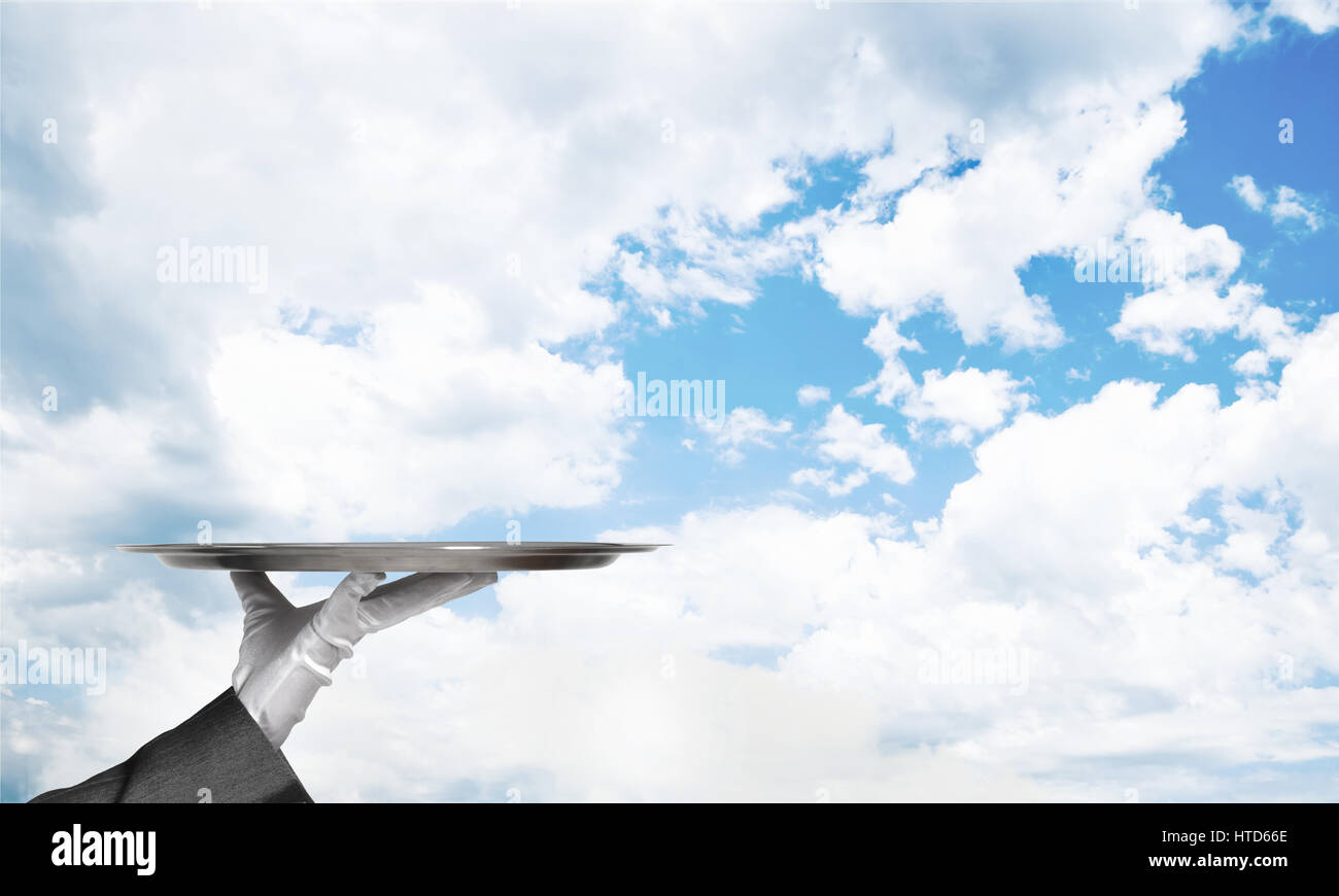 Butlers hand and arm with empty silver serving tray Stock Photo - Alamy