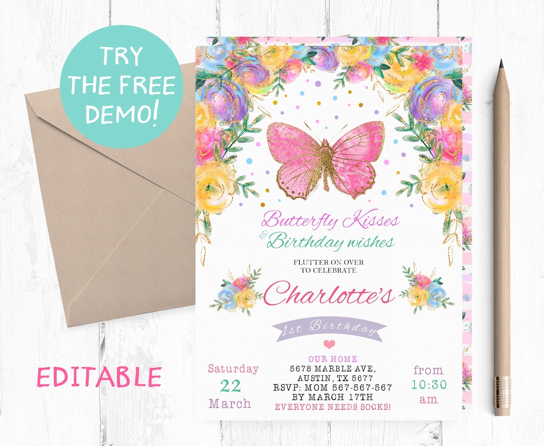 Editable Butterfly Birthday Invitation, Butterfly Kisses and Birthday ...