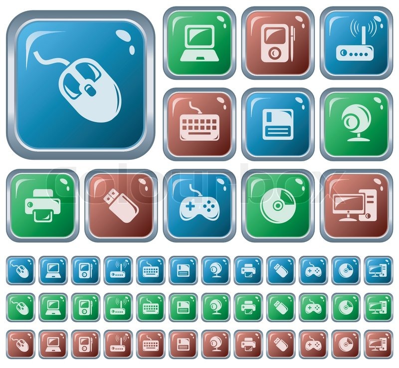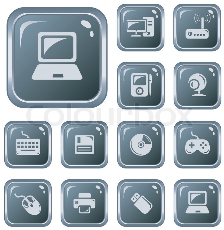 Vector illustration. Set of hardware icons on square buttons. Geometric ...