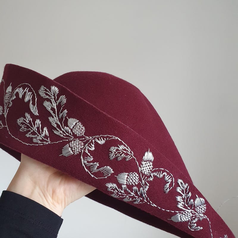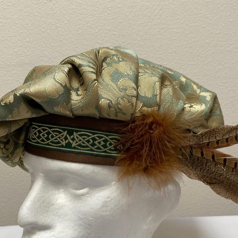 14th Century embroidered bycocket hat indoor and outdoor at twilight ...