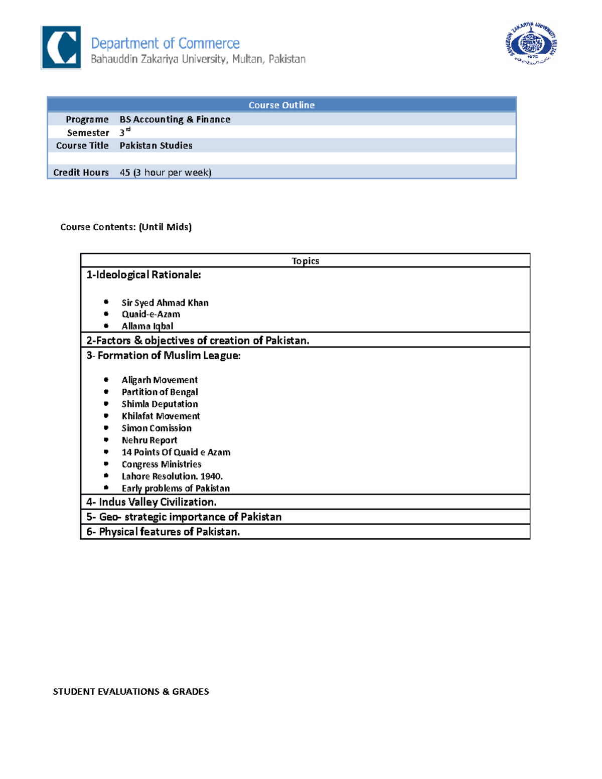 Pak study outline - bzu - Course Contents: (Until Mids) Topics 1 ...