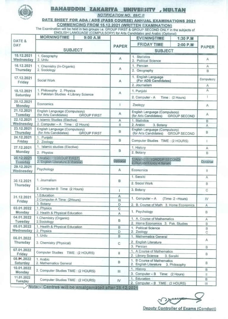 BZU Multan ADA/ADS (Pass Course) Annual Examination Date Sheet 2021