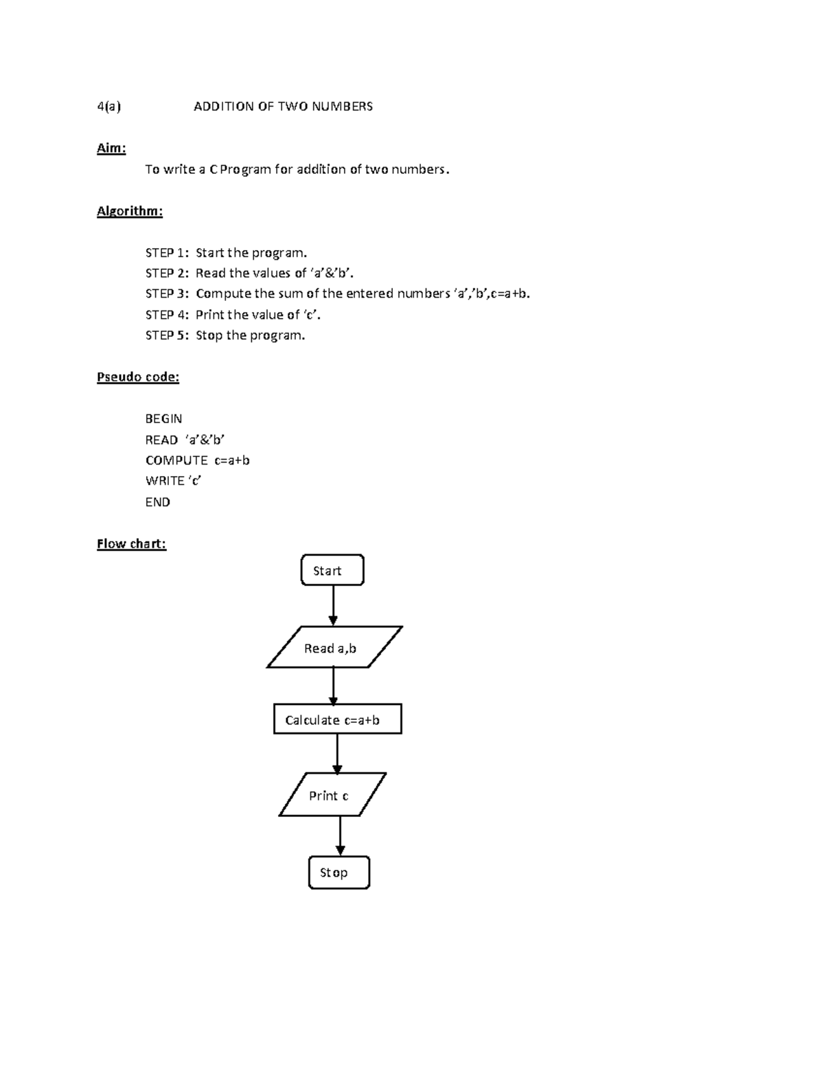 C Program Practicals: Flowchart to Add two numbers.