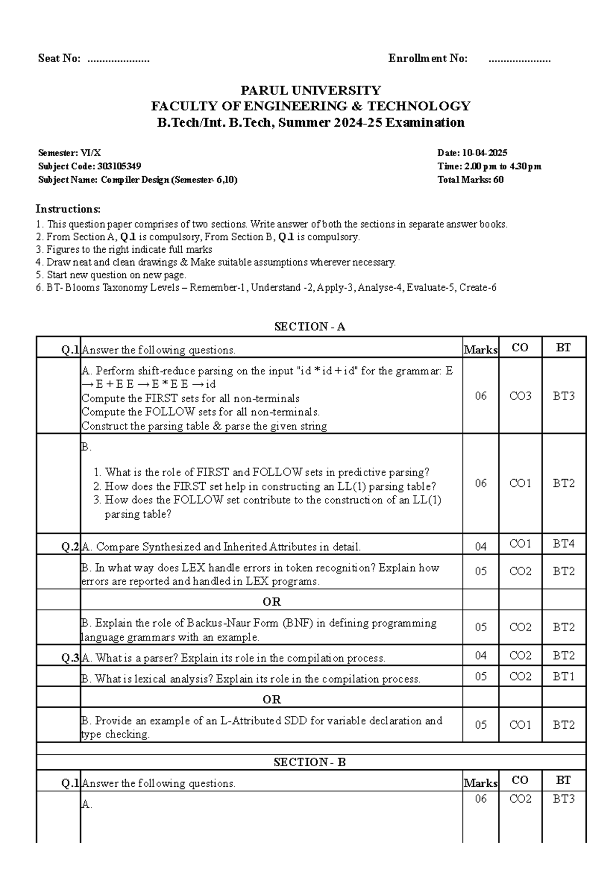 Compiler Design Exam Paper 303105349 - Summer 2023 - Studocu