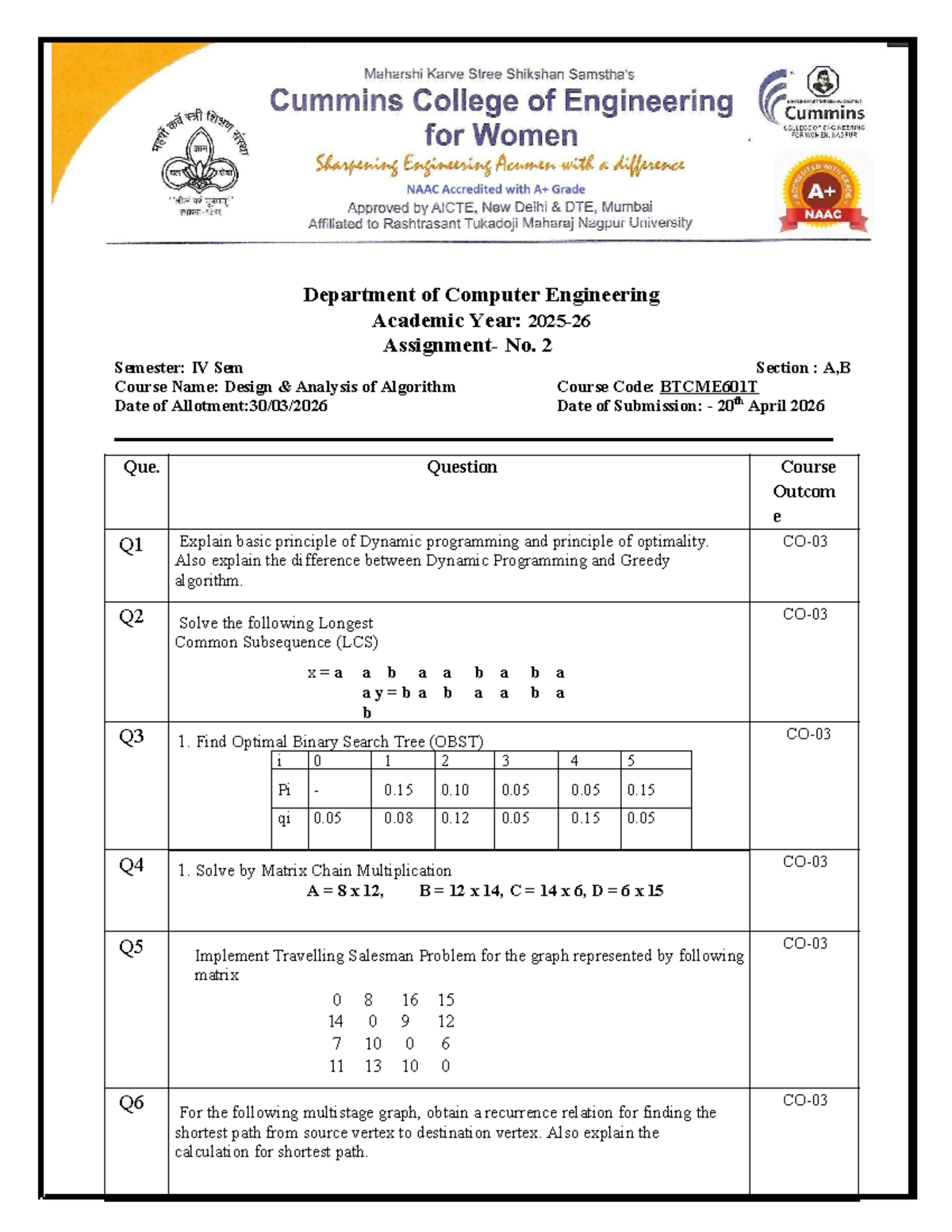 DAA BTCME601T Assignment 2 & 3: LCS, OBST, and TSP Solutions - Studocu