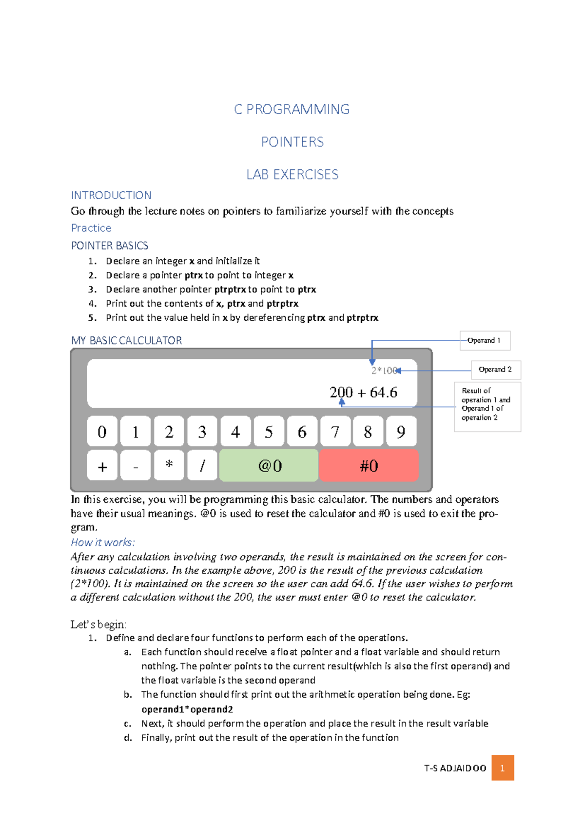 Lab 8 - C Programming Pointers Exercises and Basic Calculator - Studocu