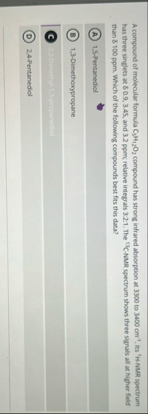 A C5H12O2 compound has strong infrared absorption at 3300 to 3400 cm⁻¹. T..