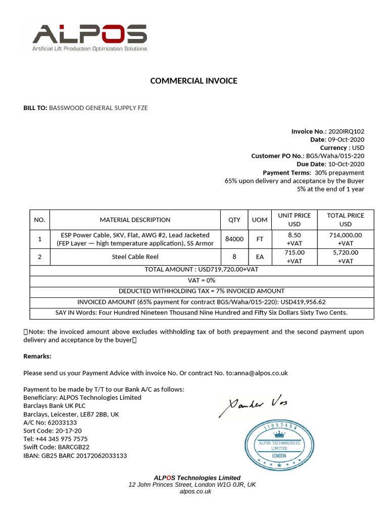 Commercial Invoice-Basswood ALPOS Contact 2nd CABLE | PDF | Invoice ...