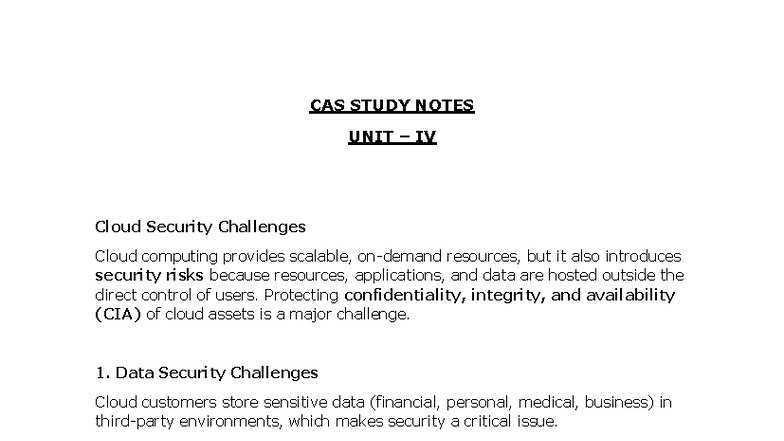 CAS - Unit IV - Cloud Security Challenges Study Notes - Studocu