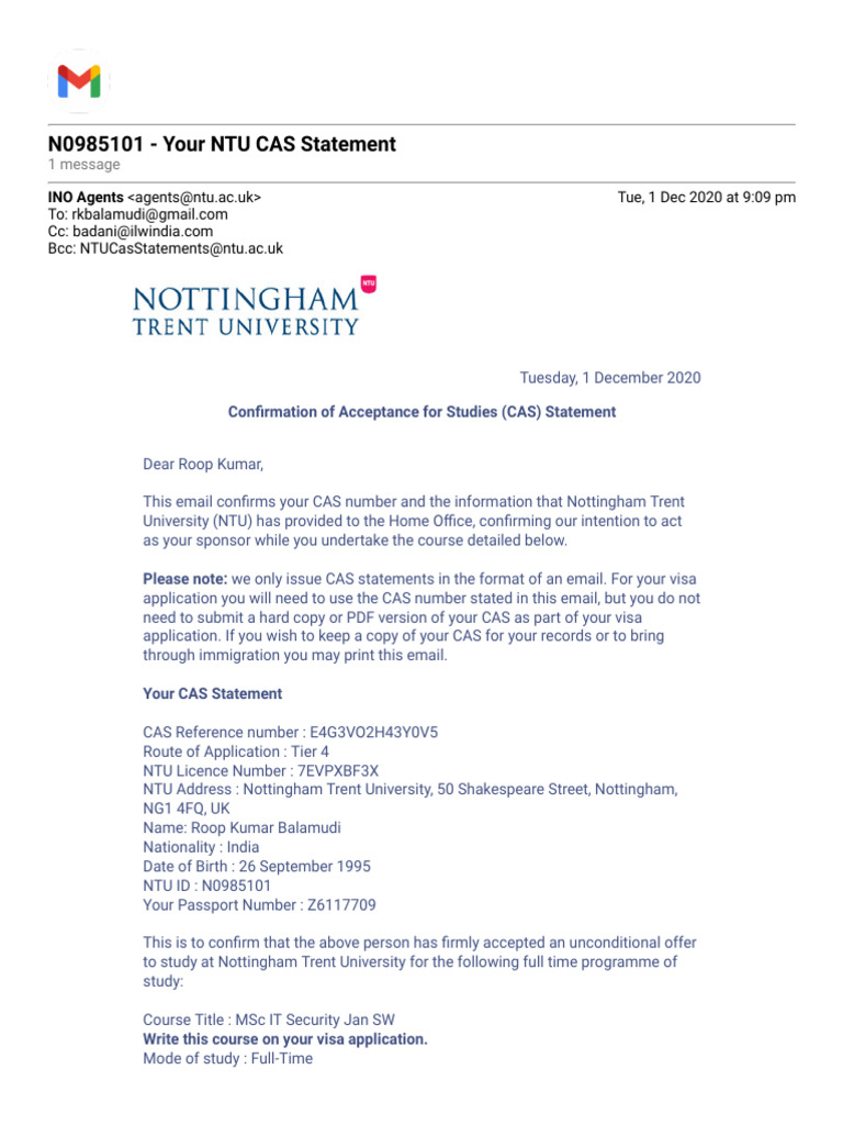 Gmail - N0985101 - Your NTU CAS Statement | PDF | Travel Visa
