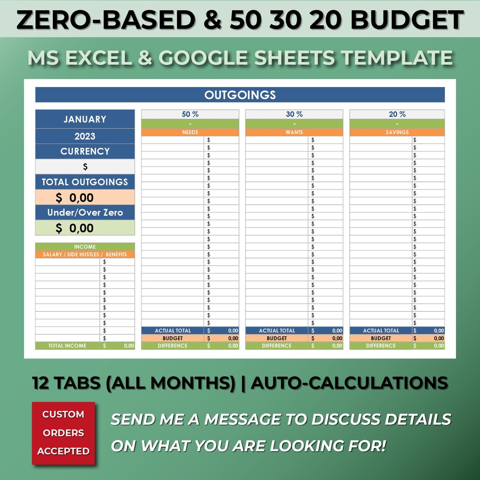 Monthly Budget Spreadsheet (zero-based Budget) Template. Excel & Google ...