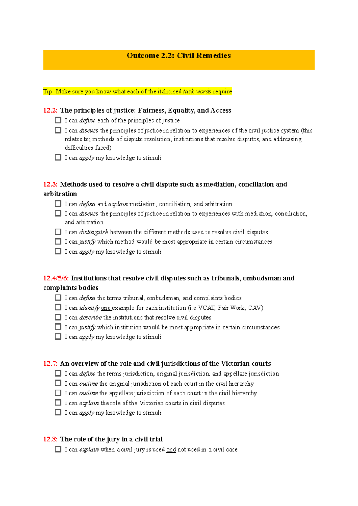 Outcome 2.2: Civil Remedies & Principles of Justice Study Checklist ...