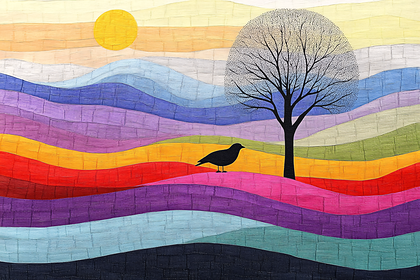 Colorful Wavy Landscape with Tree Bird and Sun Digital Art