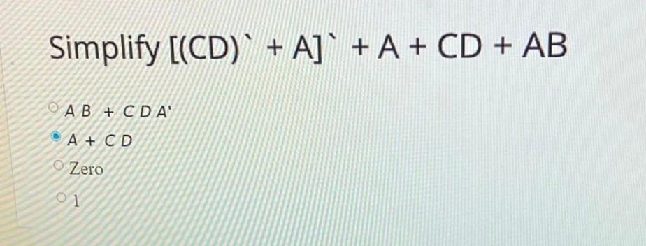 Solved Simplify [(CD) + A] + A + CD + AB A B + CDA + • A + | Chegg.com