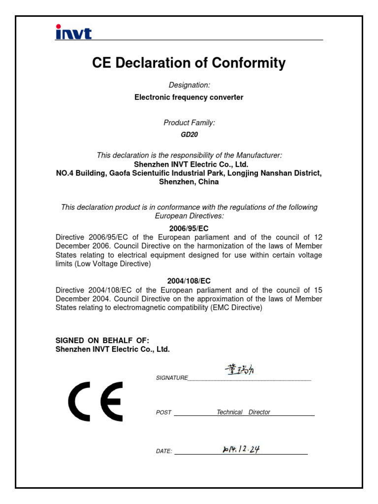 GD20 CE Declaration of Conformity | PDF | Alternating Current | Mains ...
