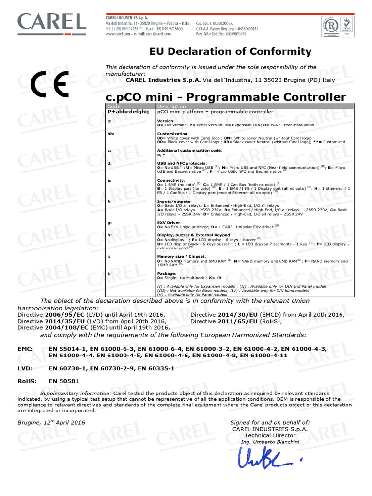 CE Declaration for c.pco Mini Programmable Controller (2)(Carel) | PDF ...