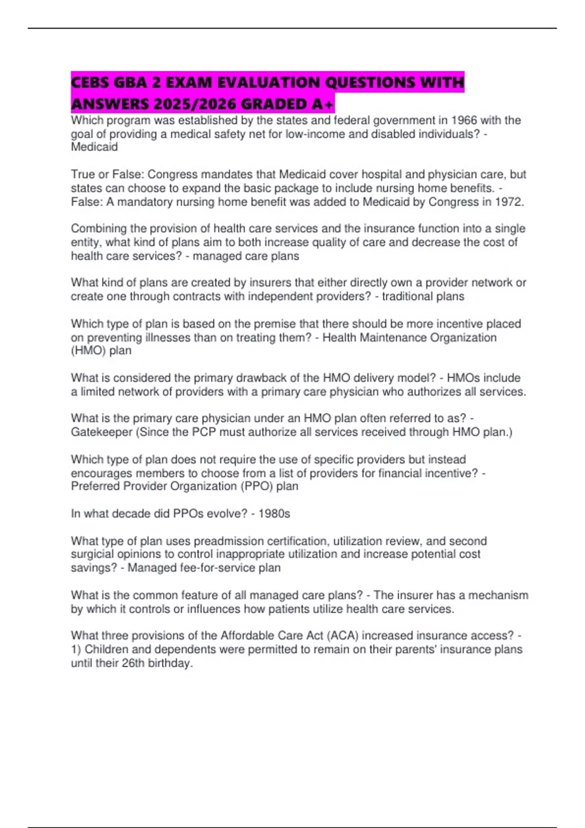 CEBS GBA EXAM 1 TEST RATED 100% CORRECT (A+) | Exams Nursing | Docsity