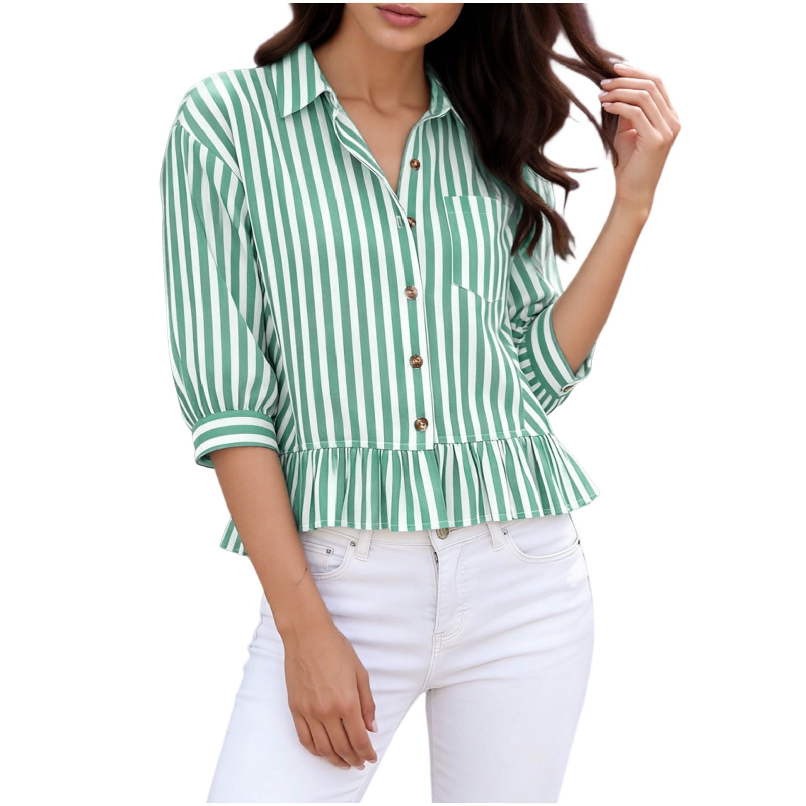 3/4 Sleeve Shirt Womens Ruffle Hem Button Down Shirts Summer Cropped ...