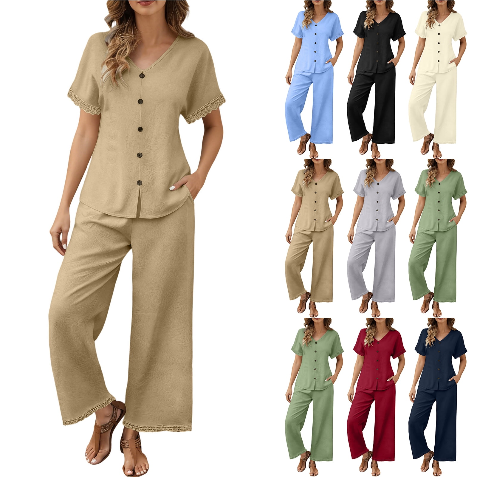 Bloomae Women's Casual 2 Piece Outfit Lace Trim Short Sleeve Button V ...