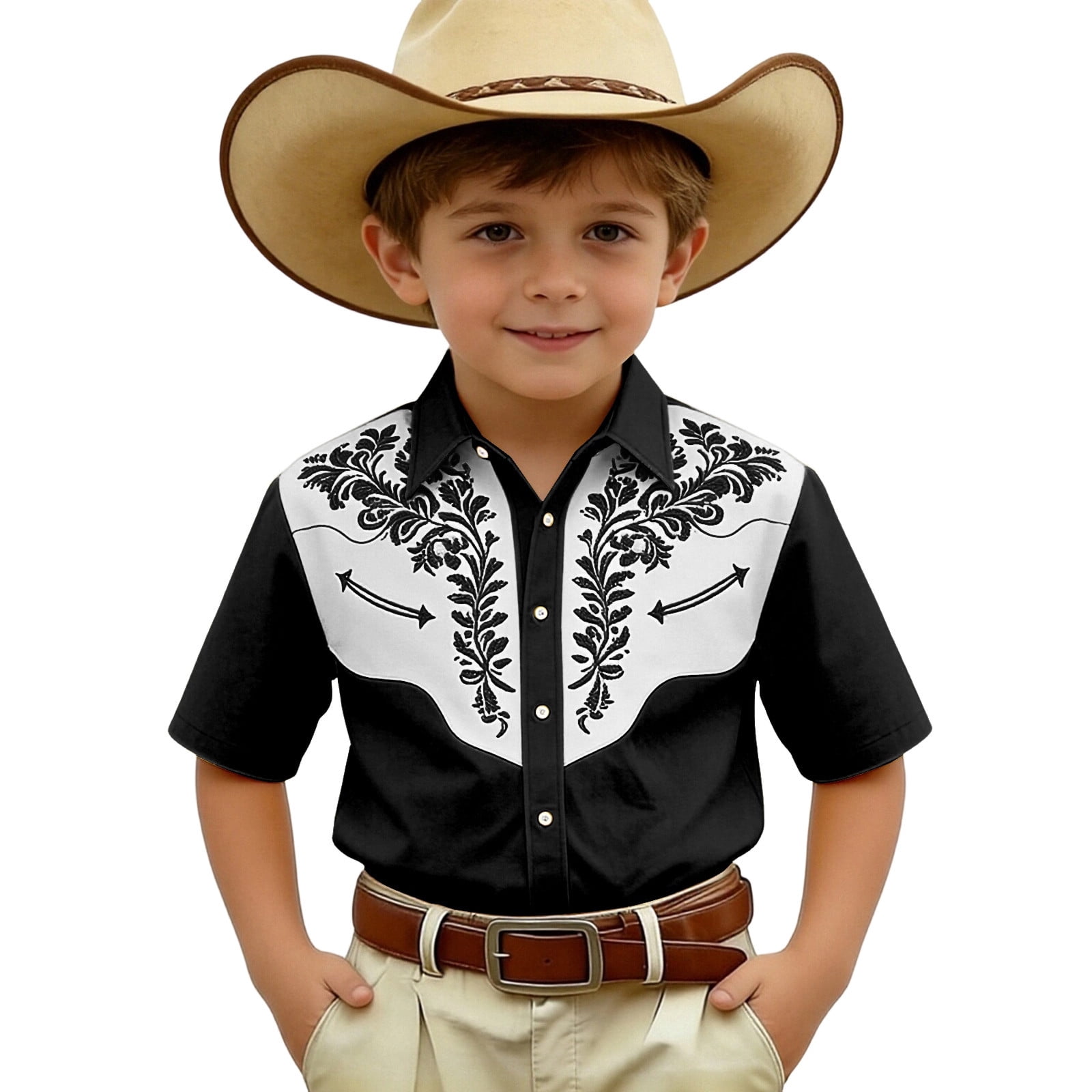 WOYY Boys Vintage Cowboy Short-Sleeve Shirt Kids Embroidery Button Down ...