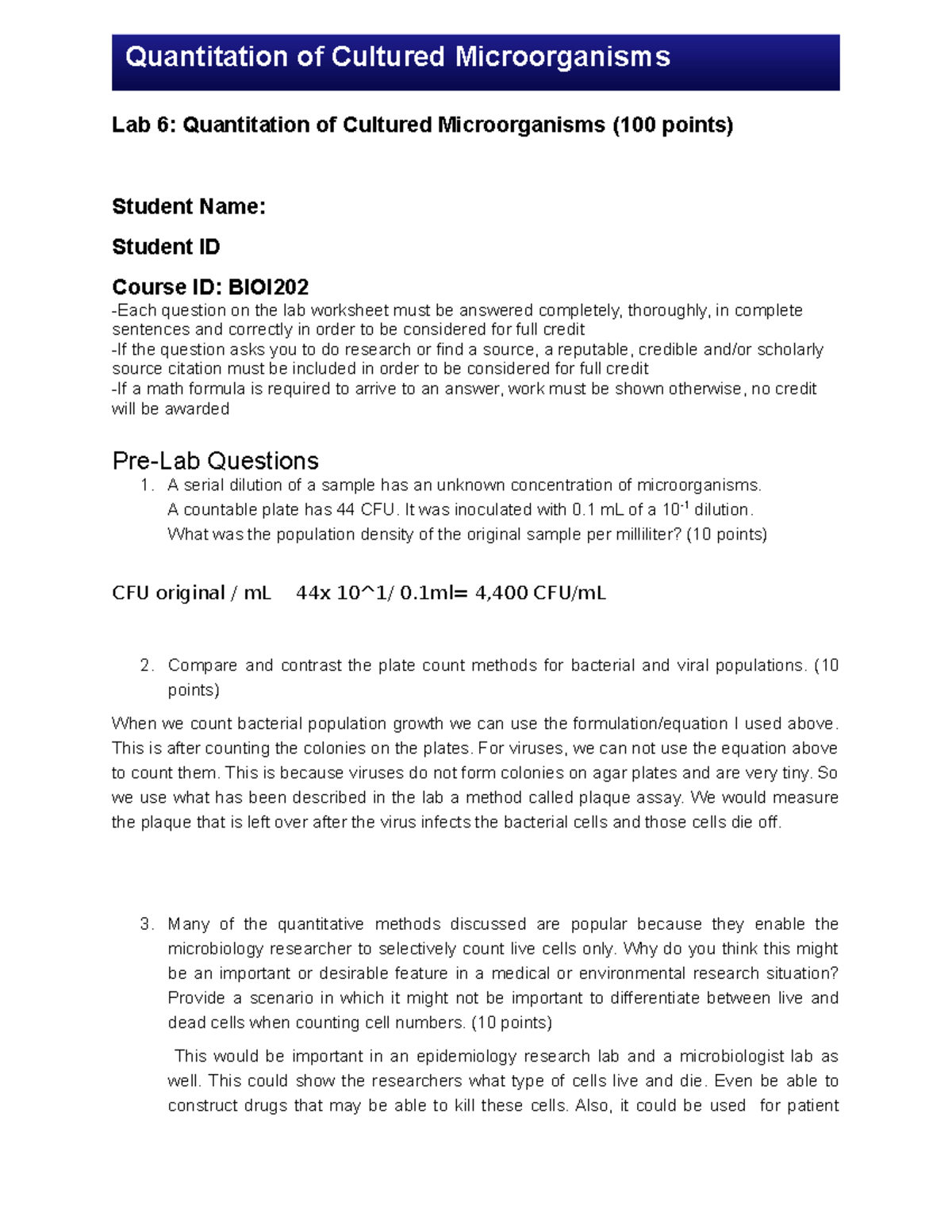 Lab-6-Quantitation of Cultured Microorganisms - A countable plate has ...