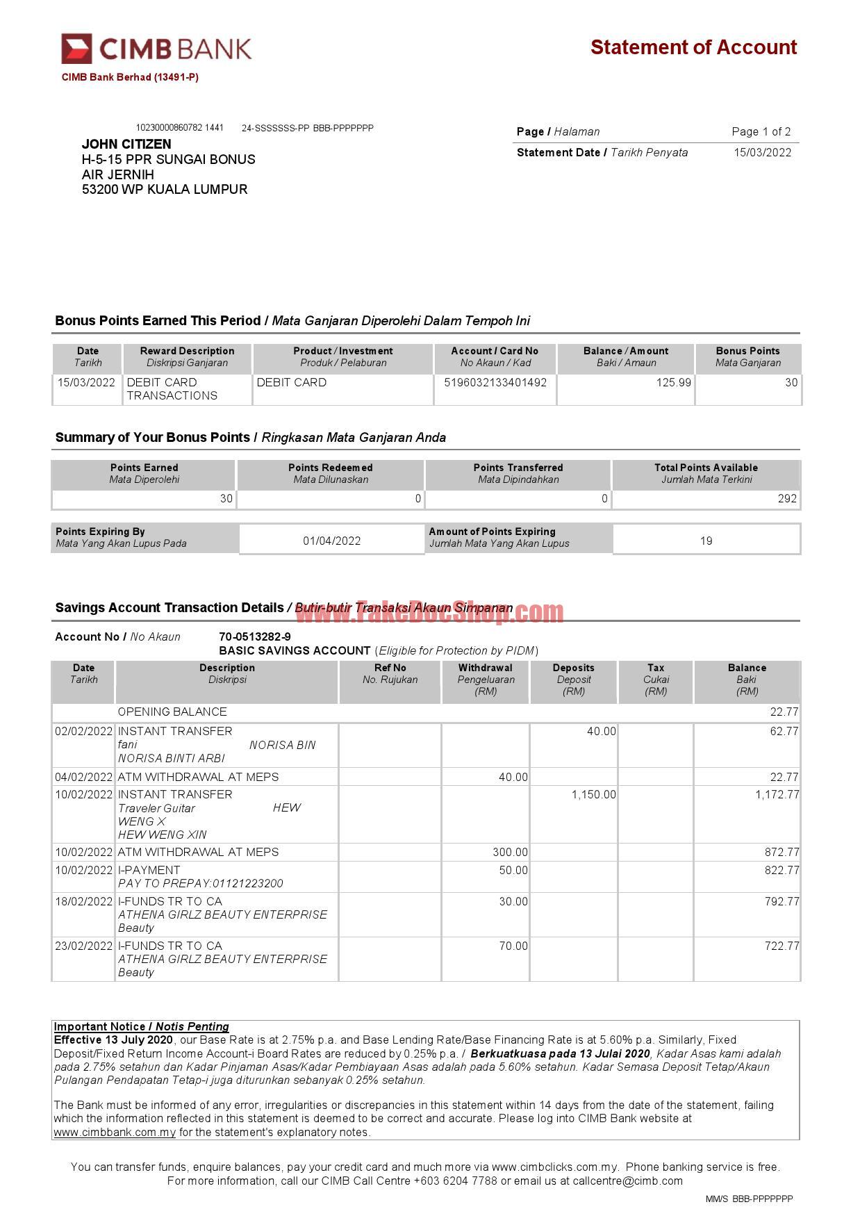 Malaysia CIMB Bank Statement Word And PDF Template (2 Pages) - Fakedocshop