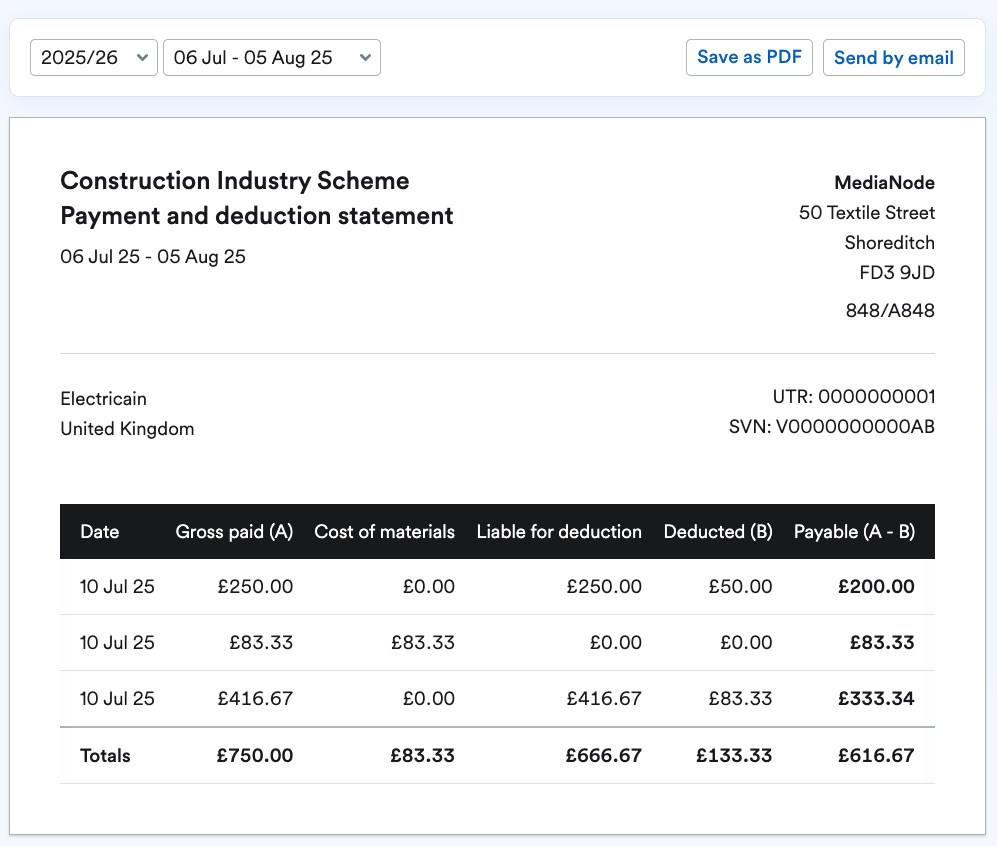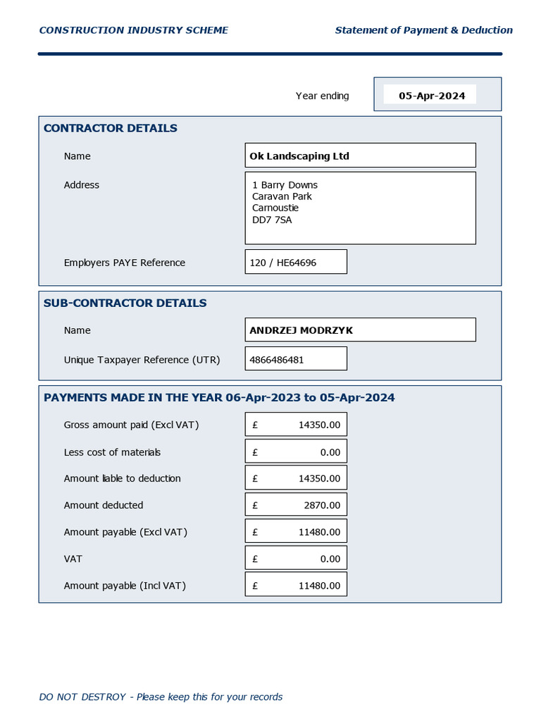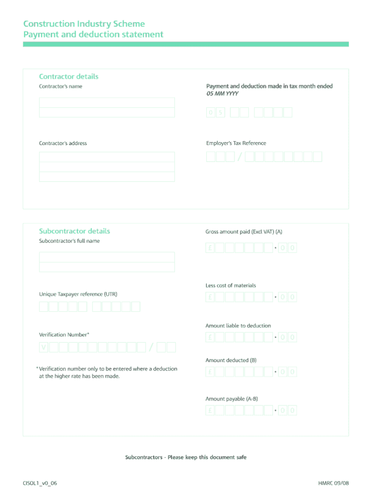 Construction Industry Scheme (CIS) payment deduction statement ...