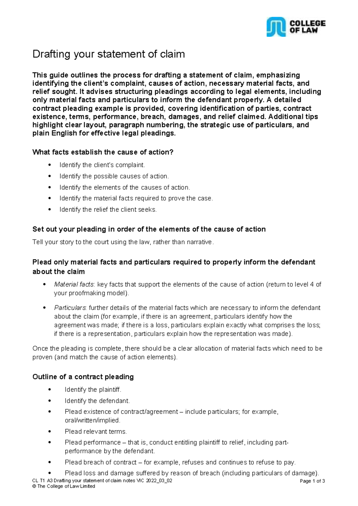CL T1 A3 Drafting Pleadings Notes - VIC 2023 - Studocu